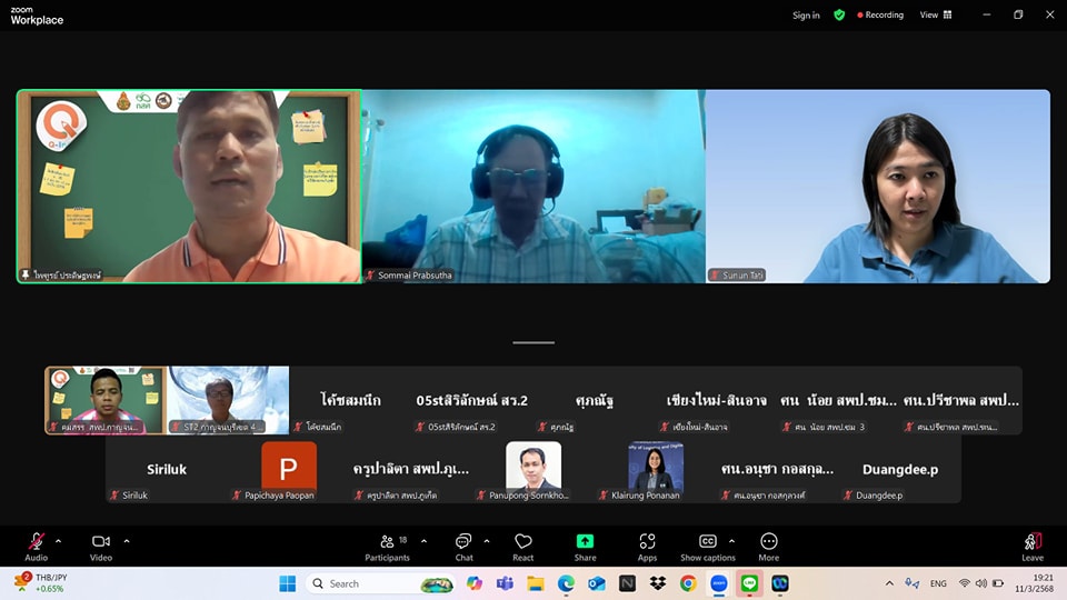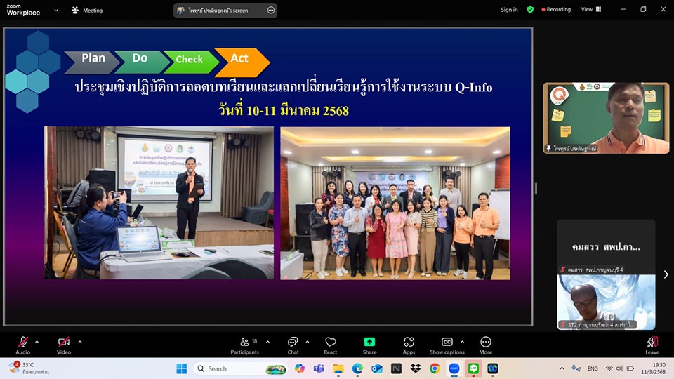 วันที่ 11 มีนาคม 2568 เวลา 18.00-20.00 น. นายโชติวัฒน์ โชติวัฒนภักดิ์ ผู้อำนวยการ สพป.กาญจนบุรี เขต 4 มอบหมายให้ นายไพฑูรย์ ประดิษฐพงษ์ พร้อมด้วยนายคมสรร วิเศษสิงห์ ศึกษานิเทศก์ สพป.กาญจนบุรี เขต 4 ในฐานะ TF ของทีมพัฒนาระบบ มหาวิทยาลัยนเรศวร เข้าร่วมการประชุมร่วมระหว่างคณะทำงานเขตพื้นที่และคณะทำงานสนับสนุนเพื่อหารือร่วมกันและสะท้อนผลการดำเนินงานในพื้นที่ปฏิบัติงาน ครั้งที่ 8 ภายใต้โครงการส่งเสริมการใช้สารสนเทศคุณภาพ (Q-Info) สำหรับโรงเรียนและศึกษาแนวทางการพัฒนาระบบสำหรับสำนักงานเขตพื้นที่การศึกษา สังกัด สพฐ.ผ่านระบบ Zoom Meeting