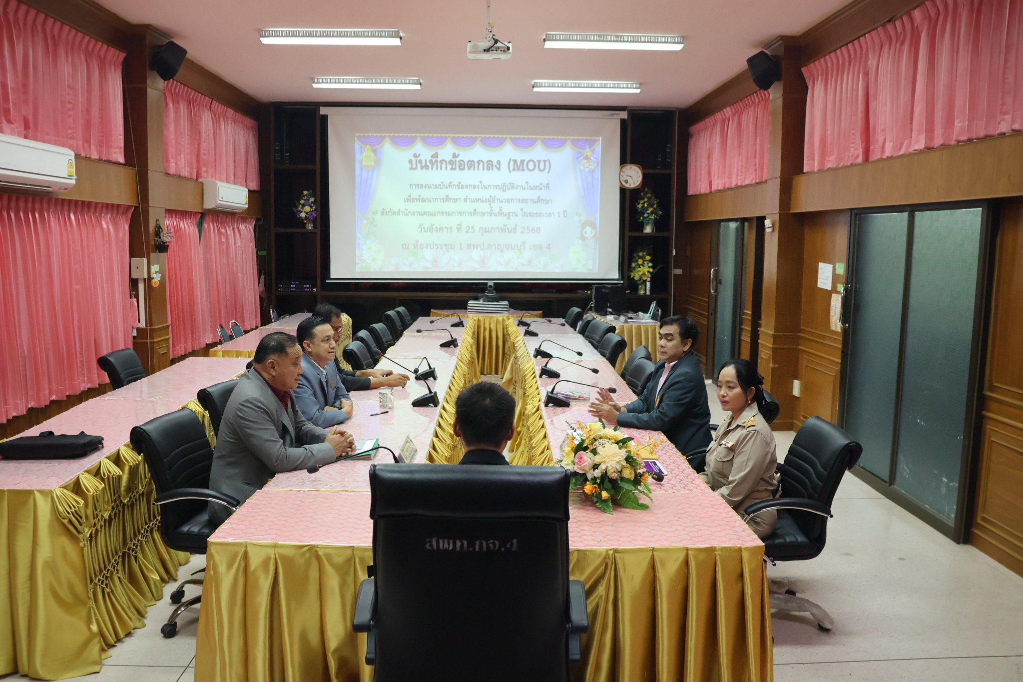 วันที่ 25 กุมภาพันธ์ 2568 นายโชติวัฒน์ โชติวัฒนภักดิ์ ผู้อำนวยการ สพป.กาญจนบุรี เขต 4 พร้อมด้วย ดร.ประภาส กองจันทร์ รองผู้อำนวยการ สพป.กาญจนบุรี เขต 4 เป็นประธานในการลงนามบันทึกข้อตกลงในการปฏิบัติงานในหน้าที่ ตำแหน่งผู้อำนวยการสถานศึกษา (MOU) และการชี้แจงการประเมินสัมฤทธิผลการปฏิบัติงานในหน้าที่เพื่อพัฒนาการศึกษา เป็นระยะเวลา 1 ปี พร้อมด้วย บุคลากรกลุ่มบริหารงานบุคคล เข้าร่วมต้อนรับและแสดงความยินดี โดยมี นางสาวนันท์นัทธฉัตร ศรีวิเศษ ผู้อำนวยการโรงเรียนราษฎร์บำรุงธรรม เข้าร่วมลงนาม ฯ ณ ห้องประชุม 1 อาคารมนตริวัต สพป.กาญจนบุรี เขต 4