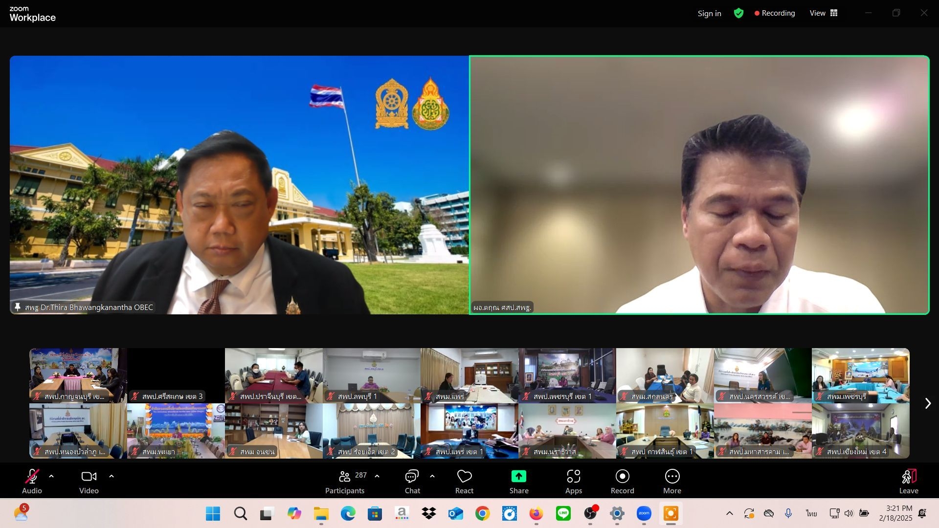 วันที่ 18 กุมภาพันธ์ 2568 นายโชติวัฒน์ โชติวัฒนภักดิ์ ผู้อำนวยการ สพป.กาญจนบุรี เขต 4 มอบหมายให้ นายบรรพจน์ ทัพซ้าย รองผู้อำนวยการ สพป.กาญจนบุรี เขต 4 พร้อมด้วย นางสาวศนิษฐา อมรพรหมภักดี ผู้อำนวยการกลุ่มส่งเสริมการจัดการศึกษา นางสาวพรมนัส ขำพระบุตร นางสาวเกศมณี ศรีคล้ายเงิน และนางสาวกีรตี บัวซ้อน บุคลากร สพป.กาญจนบุรี เขต 4 เข้าร่วมประชุมเน้นย้ำมาตรการป้องกัน แก้ไข และรายงานผลกระทบจากปัญหาฝุ่นละอองขนาดเล็ก โดยมี นายธีร์ ภวังคนันท์ รองเลขาธิการ กพฐ. เป็นประธานเปิดการประชุม ฯ ผ่านระบบ Zoom Meeting ณ ห้องประชุม 3 อาคารโพธิ์งาม สพป.กาญจนบุรี เขต 4