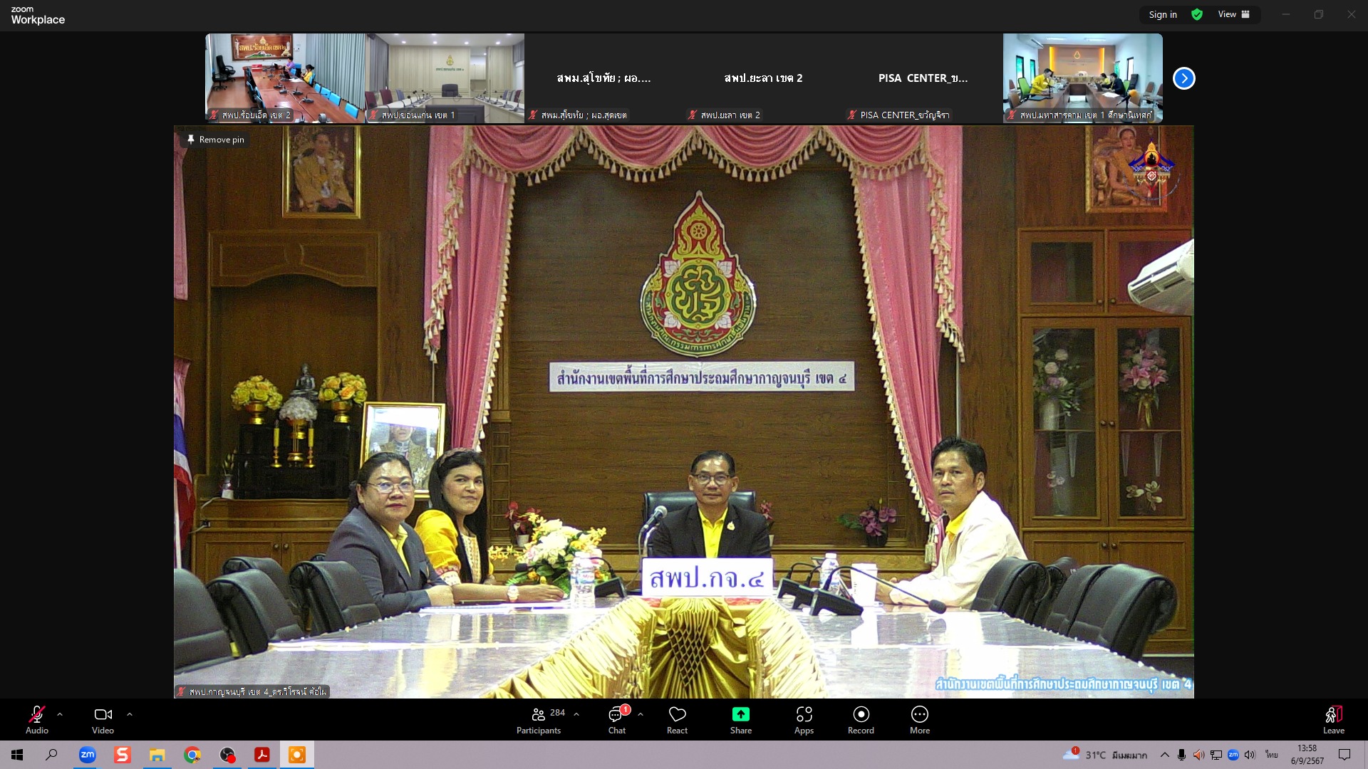 วันที่ 6 กันยายน 2567 เวลา 14.00 น. ดร.วิโรจน์ ค้อไผ่ ผู้อำนวยการสำนักงานเขตพื้นที่การศึกษาประถมศึกษากาญจนบุรี เขต 4 พร้อมด้วย นางสาวสัทธา สืบดา ผู้อำนวยการ กลุ่มนิเทศ ติดตาม และประเมินผลการจัดการศึกษา นายไพฑูรย์ ประดิษฐพงษ์ และนางสาวพิมพ์กมล อัครกิจมั่งมีสุข ศึกษานิเทศก์ สำนักงานเขตพื้นที่การศึกษาประถมศึกษากาญจนบุรี เขต 4 เข้าร่วมประชุมติดตาม การขับเคลื่อนเพื่อยกระดับคุณภาพการศึกษาตามแนวทางการประเมิน PISA ในระดับเขตพื้นที่ ครั้งที่ 13 โดยมี ดร.เกศทิพย์ ศุภวานิช รองเลขาธิการ กพฐ. เป็นประธานเปิดการประชุมฯ ผ่านระบบ Zoom meeting ณ ห้องประชุม 1 อาคารมนตริวัต สำนักงานเขตพื้นที่การศึกษาประถมศึกษากาญจนบุรี เขต 4